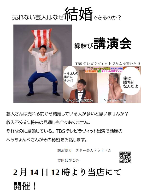2026年2月14日 / 最終更新日時 : 2026年2月25日 colorbox 未分類 講演会をやってきました!へらちょんぺ へらちょんぺです 2月14日 島根県益田市の婚活パーティで講演会をやってきました! 真剣に聞いてくれてうれしかったです タイトルは売れない芸人はなぜ結婚できるのか スタッフのみなさんと